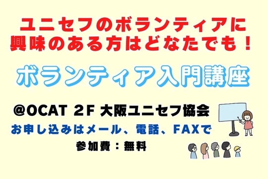 大阪ユニセフ協会の活動はすべてボランティア・メンバーにより支えられています。 ボランティアには、誰でも何時でも参加できます。参加に資格や制限はありません。現在100名以上のボランティアが登録し、積極的に活動しています。世界の子どもの問題に関心のある方、ユニセフの活動に関心のある方、支援が必要な 世界の子どもの為に何か協力したいと考えている方はぜひお問い合わせください。